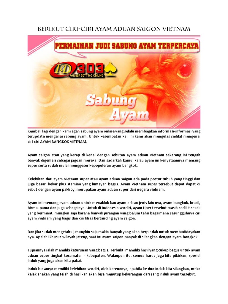 Search Q Birma Ayam Saigon Tbm Isch from Apakah keunggulan serta istimewa dari ayam pakhoy yang berasal dari vietnam ini ? 1400 sampai 1500 masehi di karawang. Please do subscribe to our channel so you can be updated for our upcoming videos. Sebelum melakukan pemilihan ayam ada baiknya anda menilai dan melihat ayam mana yang cocok untuk bisa ditaruhkan. Diceritakan, di masa itu ada seseorang tokoh yang menjabat jadi kepala desa atau lurah. Ayam aduan ini pada umumnya juga dikenal dengan sebutan ayam pakhoy adalah salah satu ayam petarung asli dari negara vietnam. Layanan livechat agen sabung ayam vietnam adalah 24 jam online dilayani langsung oleh custemer service online kami yang ramah dan profesional. Jika di bandingkan dengan datang ke arena sabung ayam langsung, taruhan di situs judi akan lebih aman dan nyaman.